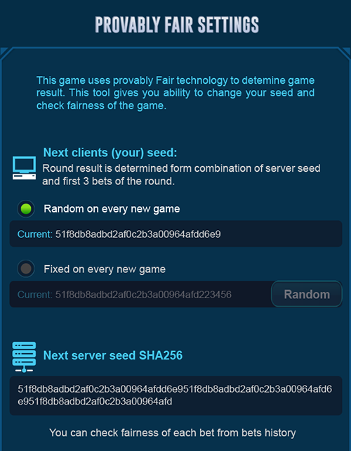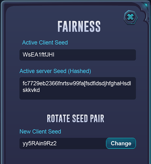 - Untuk membuktikan kewajaran, kami akan menunjukkan seed klien dan nomor acak sebelum setiap putaran, sehingga pemain dapat mengubah seed klien mereka jika mereka mau.